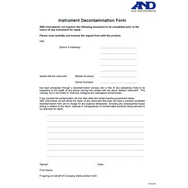 Denne formular udfyldes for alle instrumenter der skal returneres til In-JeT og/eller til fabrikanten AND. Formularen skal udfyldes, underskrives og 1) vedlægges ved forsendelse til In-JeT eller 2) anbringes uden på kassen ved forsendelser direkte til A&D